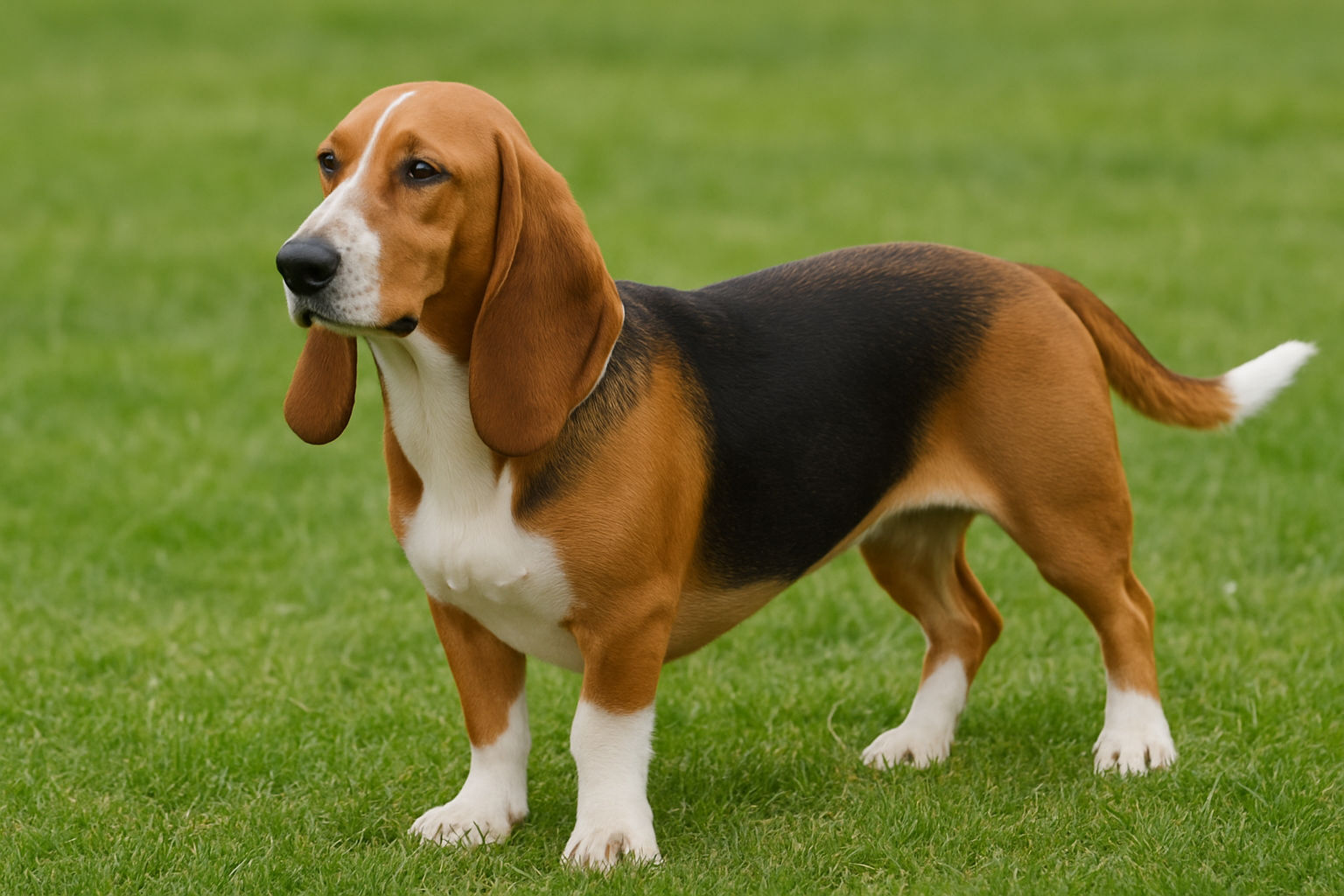 Il mantello è corto e fitto, facile da tenere in ordine, e presenta solitamente colori come il tricolore (nero, bianco e fulvo) o il bicolore (bianco e fulvo). Le orecchie lunghe non sono un semplice ornamento: durante la caccia aiutavano a “trasportare” gli odori verso il naso, rendendolo un vero segugio infallibile.