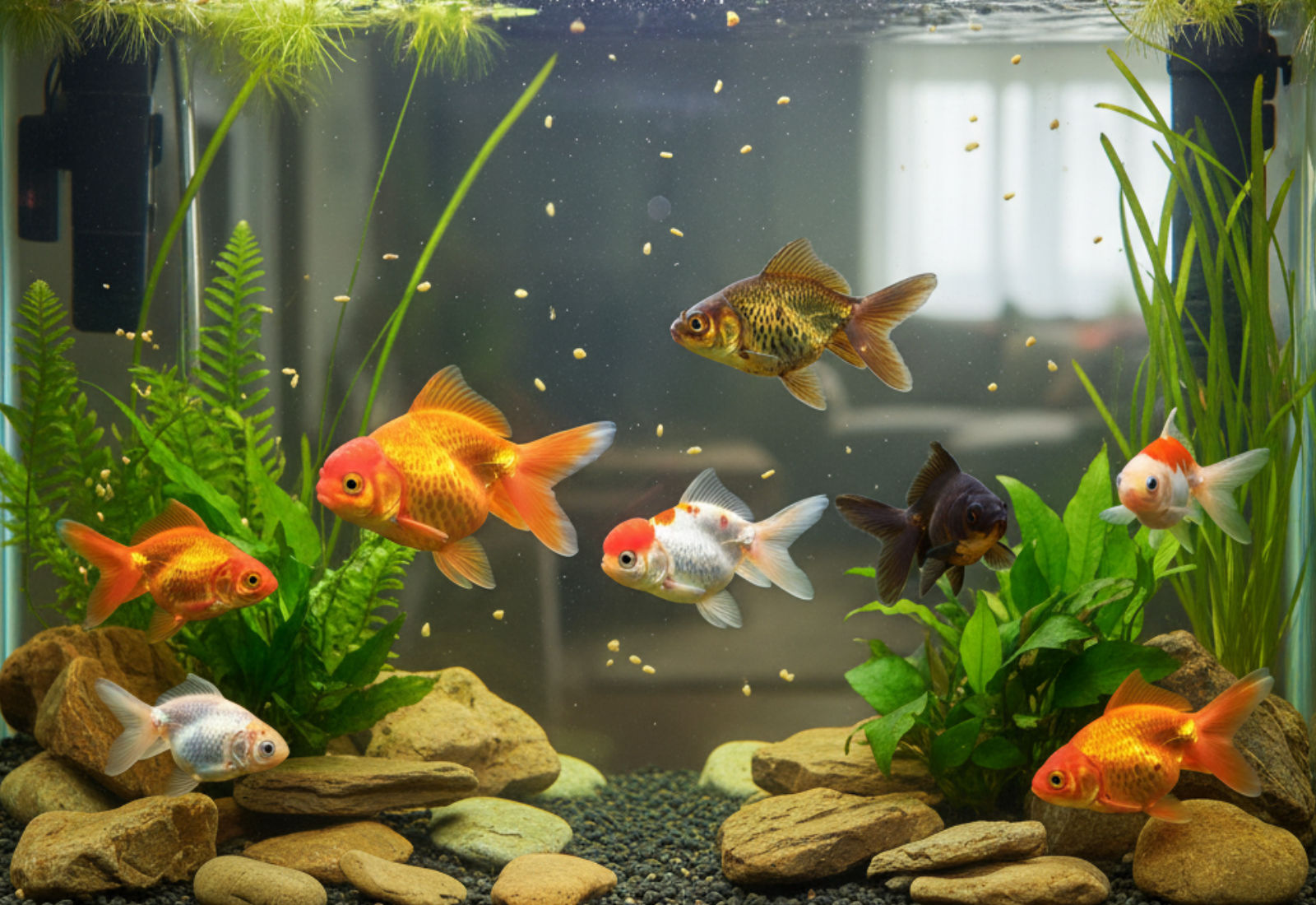 Un acquario per pesci rossi dovrebbe avere fondo di ghiaia o sabbia fine, qualche pianta resistente (meglio se vera, tipo Anubias o Elodea) e decorazioni lisce, senza spigoli affilati. Alcune varietà di pesce rosso hanno pinne lunghe e delicate, che si possono danneggiare facilmente contro superfici ruvide.