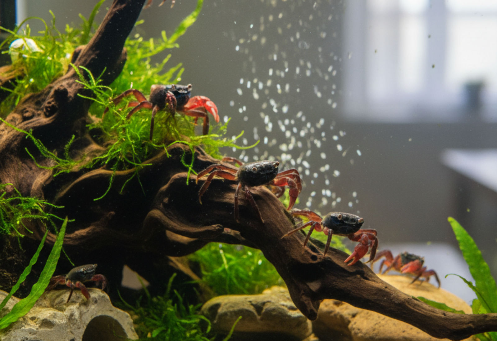 Una dieta equilibrata include verdure come zucchine e spinaci sbollentati, frutta in piccole dosi, pellet specifici e occasionalmente piccoli insetti o cibi proteici. Questo non solo li mantiene in salute, ma influisce positivamente sulla loro colorazione e sul comportamento. Evita gli eccessi, perché un granchio non è un compattatore di rifiuti: il cibo avanzato in decomposizione può inquinare rapidamente l’acqua della vasca.
