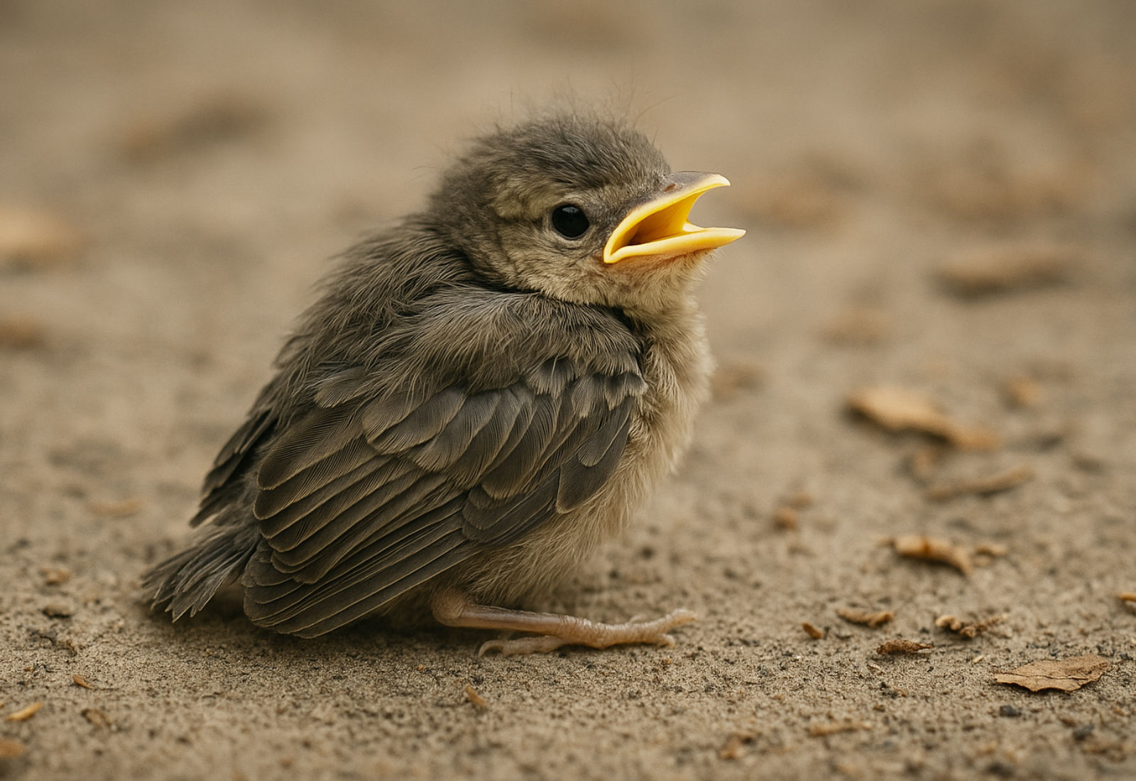 Ecco il caso più comune: un piccolo uccello ricoperto di piume sovradimensionate, che saltella scoordinato, emette pigolii disperati e ti fa venire voglia di adottarlo subito. La buona notizia è che spesso non ha bisogno del tuo intervento diretto. I genitori sono nei dintorni e continuano a nutrirlo a terra, anche se tu non li vedi nei primi minuti. Basta osservare da lontano, con pazienza, e noterai che mamma o papà passeranno a imboccarlo.