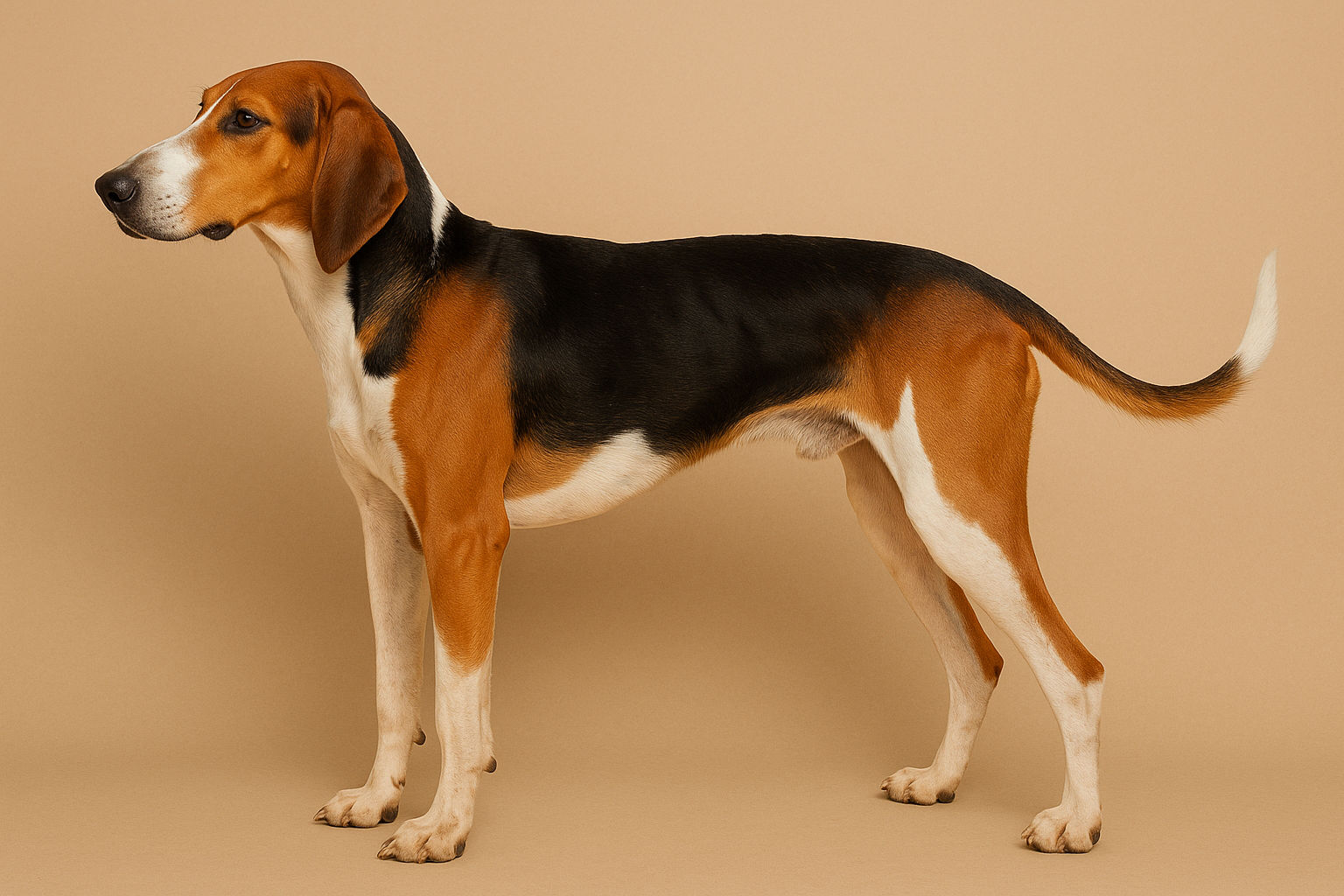 Il mantello del Poitevin è corto e fitto, facile da mantenere, e presenta solitamente le combinazioni di bianco, nero e fulvo. È il classico tricolore da segugio, ma con un’eleganza che lo distingue. Gli occhi sono scuri e profondi, con un’espressione vigile e decisa, mentre le orecchie cadenti gli donano un’aria quasi aristocratica.