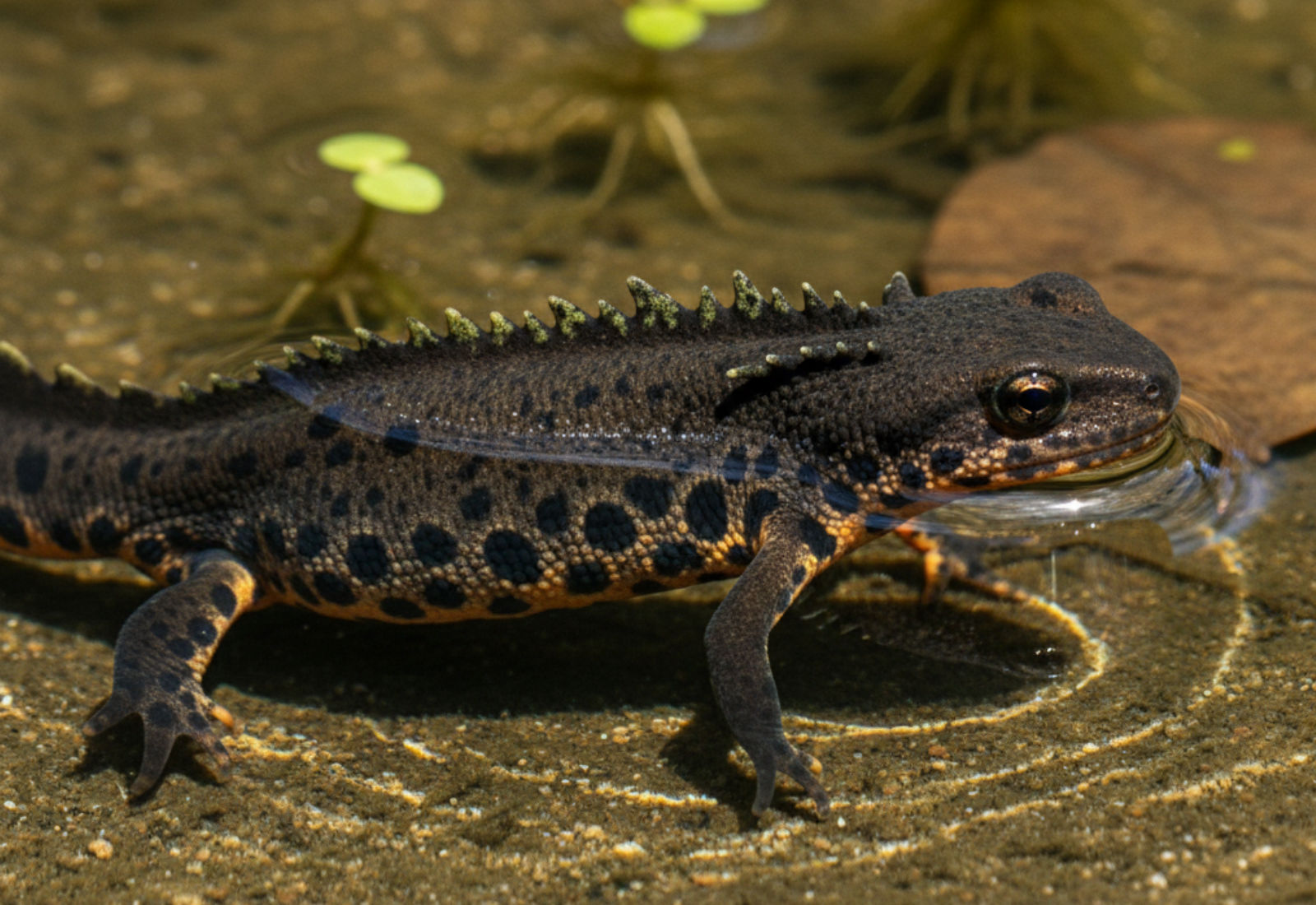 Il Triturus cristatus, o tritone crestato, è uno dei più spettacolari grazie alla cresta che i maschi sviluppano nella stagione riproduttiva. È diffuso in buona parte dell’Europa centrale e occidentale e preferisce specchi d’acqua ampi e ricchi di vegetazione.